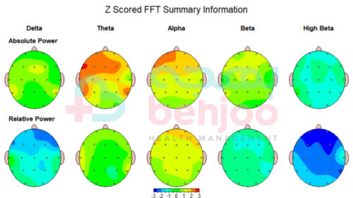 در نتیجهی این قیاس که به آن (Z scores) می گویند، اگر فعالیت مغزی فرد مشابه با جمعیت نرمال باشد با رنگ سبز نشان داده میشود. رنگ سبز نشاندهنده حالت طبیعی و نرمال است. اگر فعالیت امواج مغزی فرد از حالت طبیعی بیشتر باشد (که نشانه مشکل در عملکرد مغز است)، نرم افزار دستگاه آن را با رنگهای زرد، نارنجی و قرمز نشان میدهد و اگر فعالیت امواج تولید شده کمتر از حالت طبیعی باشد (که باز هم حاکی از اشکالی در کار مغز است)، نرم افزار آن را با رنگهای آبی و بنفش نشان میدهد. از آنجا که هر یک از اختلالات و مشکلات گوناگون مانند AD/HD و LD در اثر وجود اشکال در عملکرد مغز و در نتیجه کم و زیاد شدن امواج مغزی بهوجود میآیند، لذا نقشه مغزی فرد سالم با نقشه مغزی فردی که AD/HD دارد متفاوت است. به این ترتیب، متخصص با بررسی نقشه مغزی افراد مختلف، پی به مشکل یا توانمندیهای آنها میبرد.